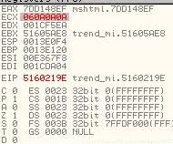But the code says that EAX will be added by 4 and then the content of EAX will be moved to ECX register. So we will have to subtract 4 from our address which will make it to be 7DD148EF. Hence the final exploit code will turn into unescape('%u48EF%u7DD1'). Now when content of EAX is moved into ECX the register will take the figures as shown below.